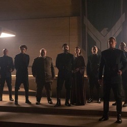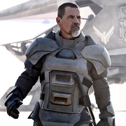 Po cichutku liczyłam, że pokażą barona Harkonnena, ale niestety. Spokojnie, jeszcze przyjdzie czas na tego dziada. Za to widzimy świtę Atrydów i jakkolwiek zdjęcie jest ciemne i niewiele widać, tak oczywiście moje oczko radowało się, że nie tylko Paul jest ubrany w stylu wojskowym. Jest pięknie.