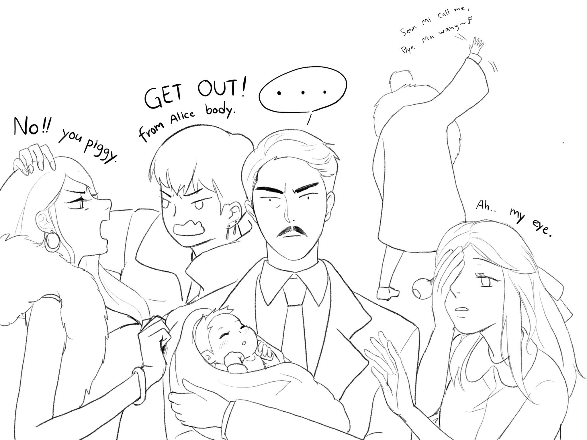 Na tym tweecie ktoś wskazał białe postacie (Niebian?) które chyba próbują powstrzymać Oh Gonga (magią?) przed udzieleniem pomocy Sam Jang: